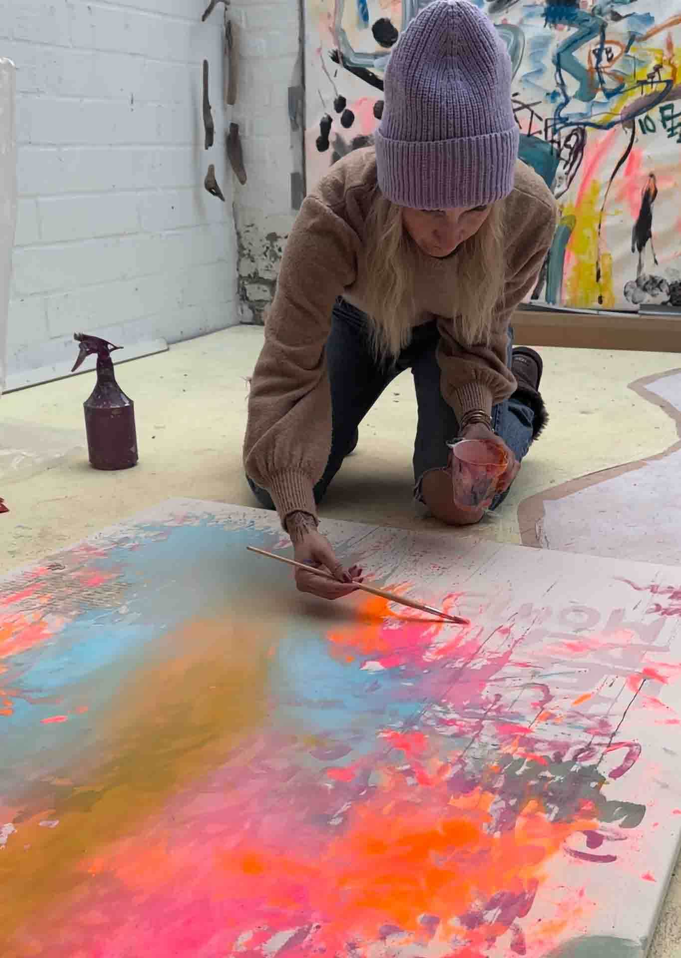 Inspiriert haben mich die Aussagen der Frauen. Darin steckt so viel Mut, Stärke und Lebenswille. Ich hatte anfangs überlegt, welche Mantren sich am besten für die Leinwand eignen. Je länger ich gegrübelt habe, desto falscher hat es sich angefühlt, eines auszuwählen. Deshalb habe ich mich dazu entschieden, alle Mantren und Lebensmottos auf die Leinwand zu bringen. Also habe ich angefangen, alle aufzuschreiben bzw. zu malen. Einige sind nicht mehr lesbar, bilden aber das Fundament des Bildes. Ich finde es schön, dass somit alle positiven Mutmacher dem Bild Energie geben. Einige Mottos werden leserlich auf dem Bild zu finden sein. Aktuell platziere ich diese und kleine Symbole, die ich aus den Erzählungen gepickt habe, auf der Leinwand. Alles in allem soll das Bild eine Sammlung aus guten Energien und schönen Momenten werden.